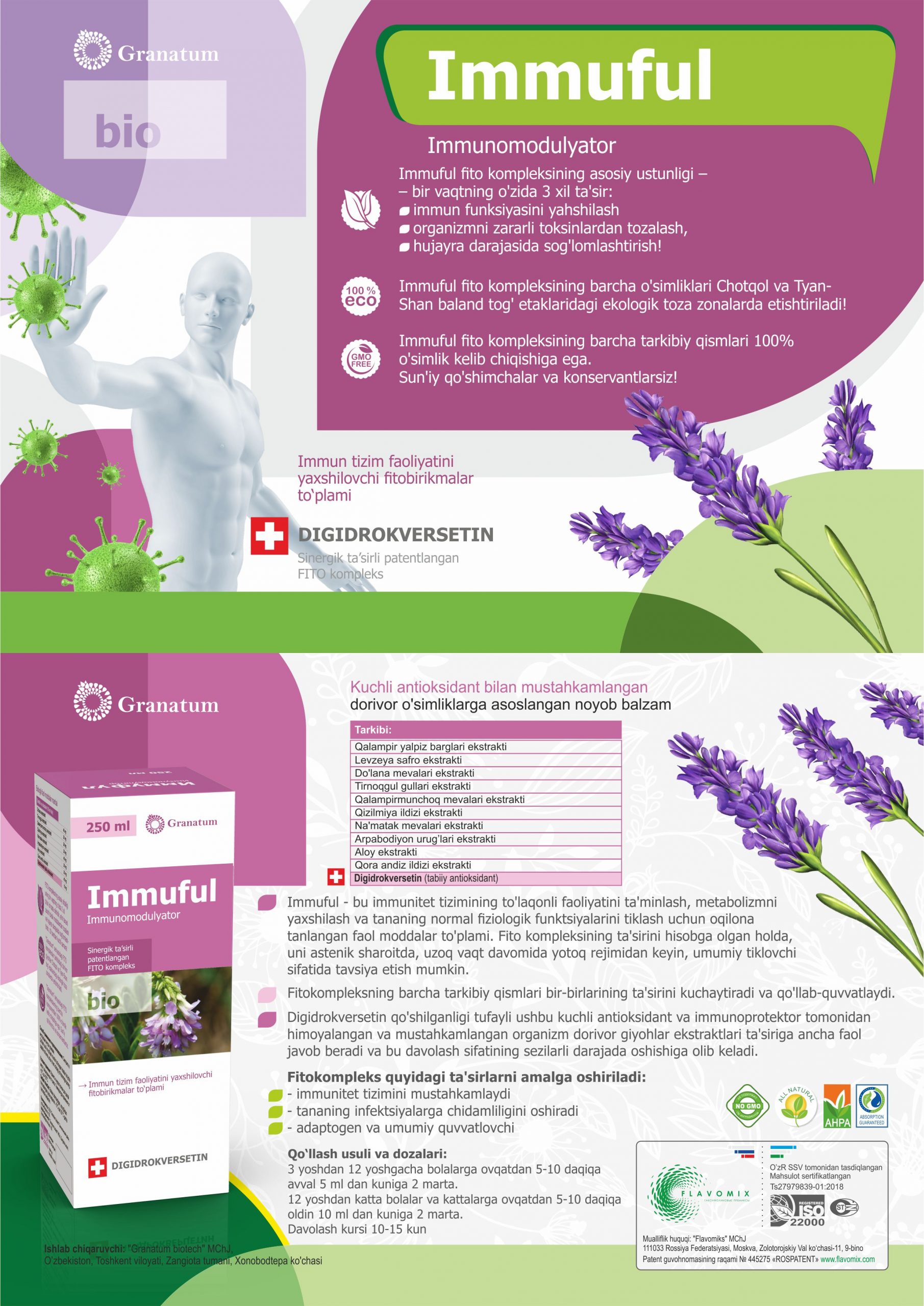 3. hujayra darajasida sog'lomlashtirish. Immuful fito kompleksining barcha o'simliklari Chotqol va Tyan-Shan baland tog' etaklaridagi ekologik toza zonalarda etishtiriladi! Immuful fito kompleksining barcha tarkibiy qismlari 100% o'simlik kelib chiqishiga ega.